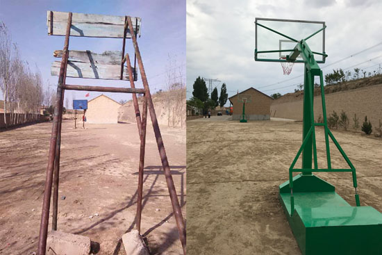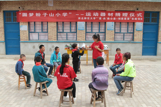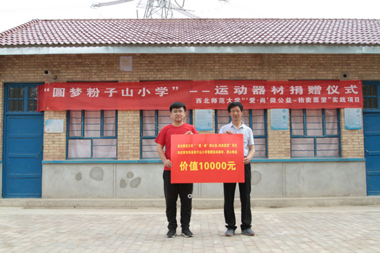 6月3日,我校“‘爱·尚’微公益——拍卖愿望”实践项目团队赴甘肃省庆阳市环县小南沟乡粉子山小学举行“圆梦粉子山小学”—运动器材捐赠仪式,为该小学募集捐赠了一副崭新的篮球架和相配套的运动器材,总价值达1万元。