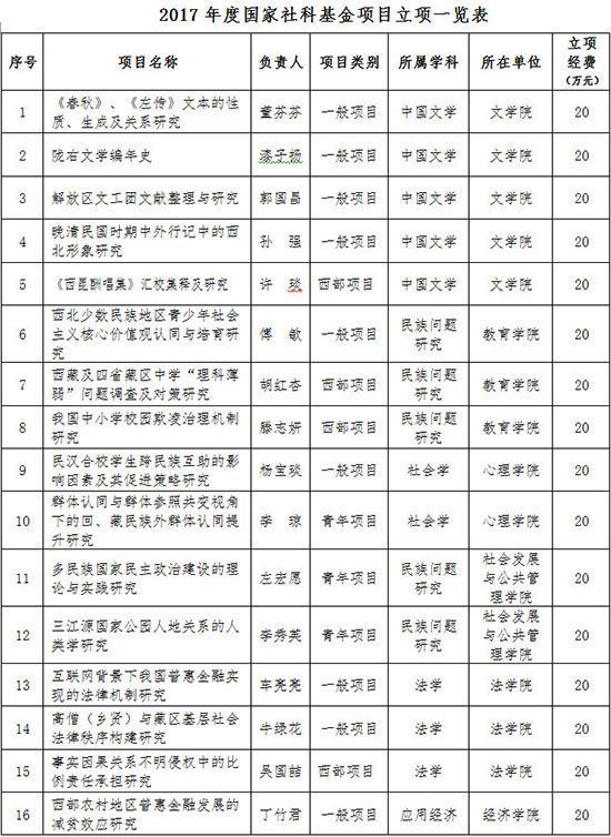 近日,2017年度国家社科基金项目评审结果公布,我校获准26项。其中,一般项目16项,青年项目3项,西部项目7项。获准项目居全省高校立项单位之首,创我校历史最好成绩。