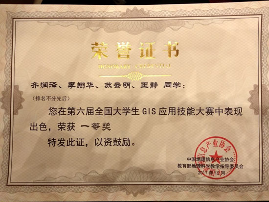 12月10日,第六届全国大学生GIS应用技能大赛在南京师范大学举行。西北师大地理与环境科学学院2015级地理信息科学专业齐润泽等四位学生荣获大赛一等奖。西北师大获“优秀组织奖”。