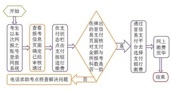 第二步:考生网上缴费。考生等待考点24小时之内审核通过后上网缴纳考试费即可。流程如下图:
