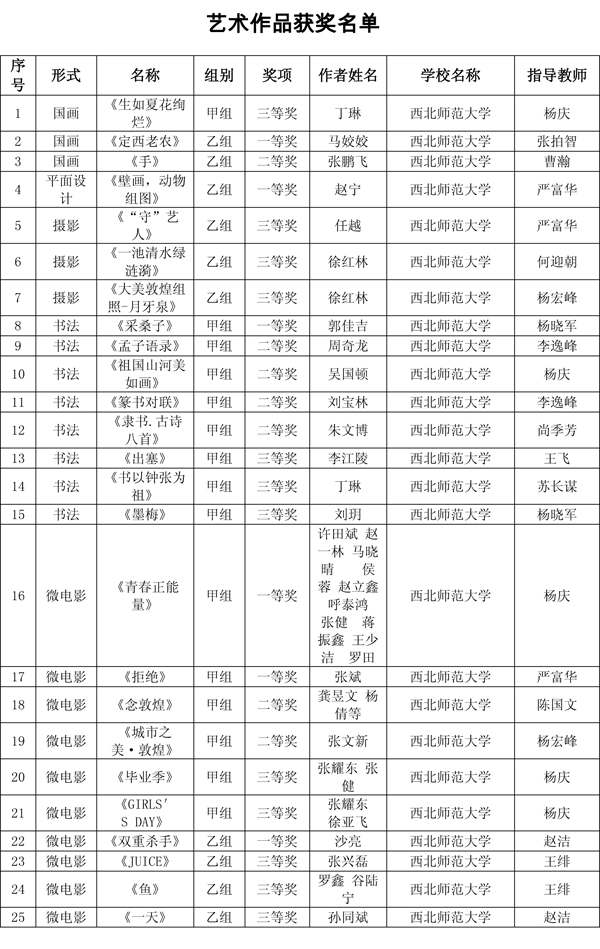 西北师大在活动中获得66项奖励,充分展示了学校艺术教育的丰硕成果,获奖等次和获奖数量为历届最高。其中,艺术表演节目类获一等奖7项、二等奖7项、三等奖3项;艺术作品类获一等奖6项、二等奖7项、三等奖12项;艺术实践工作坊获三等奖1项;艺术教育科研论文获一等奖7项、二等奖7项、三等奖7项;大学生艺术展演活动校长风采奖获奖2项;学校获“优秀组织奖”。