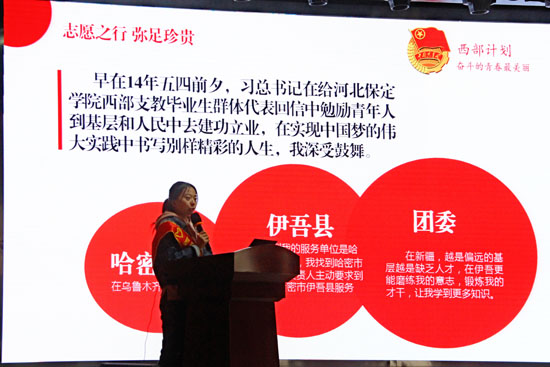 阿克苏地区团委党组副书记、宣讲团团长高凡解读了服务新疆专项的相关政策。王泽华等3名志愿者分别讲述了他们扎根西部、建功新疆的生动感人事迹和生活经历与志愿感悟,号召更多毕业生投身于西部,到祖国最需要的地方去放飞梦想,建功立业。