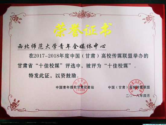 青年全媒体中心获“甘肃省十佳校媒”荣誉称号