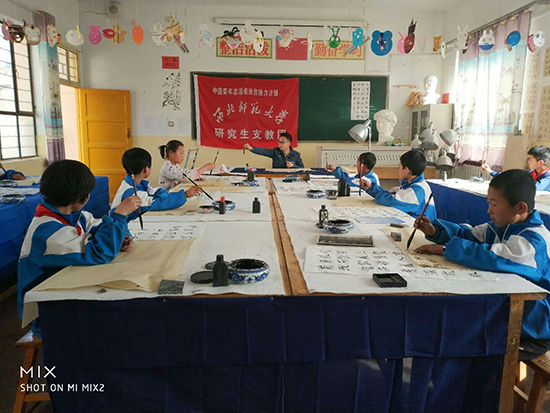 陇山学校坐落于定西市通渭县陇山乡黄家窑村,交通不便。六个小时的路程,志愿者薛斌斌每次周末从兰州返程回去,都不忘买一些墨汁与宣纸带给支教点的学生们。作为一名书法专业的大学生,他在学校组织爱好书法的学生们开展了“爱·传承——走进书法”活动,通过书法知识、技能的传授,使学生们了解了书法的悠久历史,提升了学习书法的浓厚兴趣。