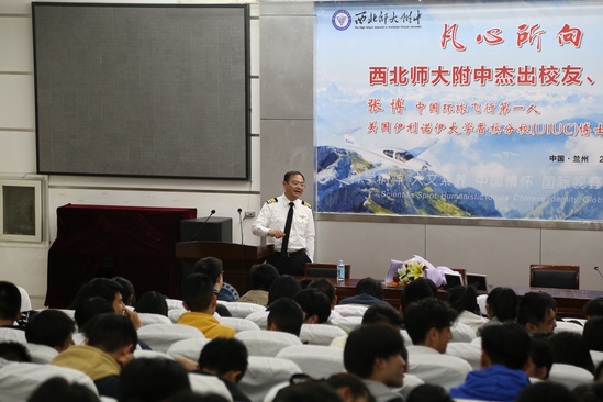 4月15日,西北师大附中1983届校友、国际英才班首席教师、中国环球飞行第一人、美国伊利诺伊大学香槟分校博士张博第二次环球飞行顺利飞抵兰州,专程返回母校为西北师大附中师生作专题报告。
