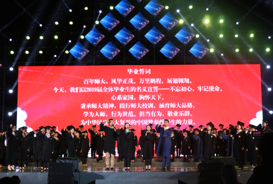 随后,2019届毕业生庄严宣誓:“百年师大,风华正茂。万里鹏程,展翅翱翔。今天,我们以2019届全体毕业生的名义宣誓——不忘初心,牢记使命。心系家国,胸怀天下。秉承师大精神,践行师大校训,涵育师大品格。学为人师,行为世范。担当有为,敬业乐群。为中华民族伟大复兴的中国梦奉献毕生的力量。”表达了西师学子传承精神、爱国奋进、奉献国家、追逐梦想的坚定决心。