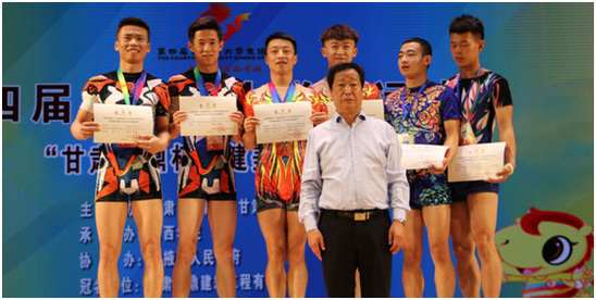 7月18日,第四届省大运会“甘肃宏鼎”杯健美操比赛结束,西北师大代表团获佳绩。西北师大代表团副团长、副校长、体委主任张生勇为获奖运动员颁奖。