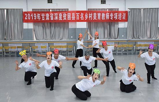本次培训由省教育厅、西北师大联合主办,甘肃省中小学艺术教育与研究中心、西北师大舞蹈学院承办。在为期10天的培训中,由8所大、中、小学的18位美育专家组成的教学团队紧密结合甘肃省基础教育现状,分班教授舞蹈、美术、音乐三个版块的美育课程,传授了最新的美育教育教学理念和前沿的教学方法。来自全省23个深度贫困县的100名乡村美育教师接受培训。此次培训,完成了音乐教学成果10个、素质教育舞蹈课例6个、美术作品400余幅;每位学员提交3篇学习心得,内容涵盖艺术类课程教学、教师发展、评价管理等方面。