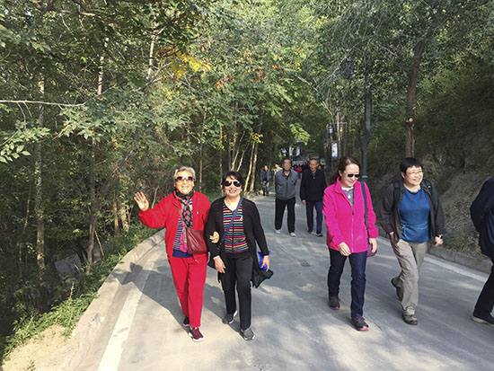 老同志们相互搀扶、欢声笑语,神采奕奕、阔步向前;来到山顶,他们极目远眺,纷纷表示看到祖国发展得如此美好,心情很激动;希望在有生之年,更加珍惜现在的幸福生活,发挥余热,为学校发展多做贡献。