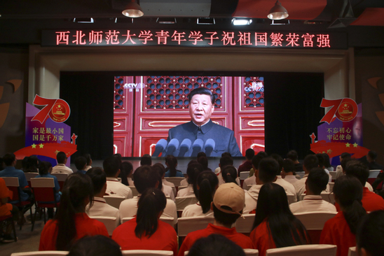 70年弹指一挥间,新时代迈步从头越。站在新的历史起点上,爱国、奋斗、担当,肩负起我们这一代人的历史使命,为实现中华民族伟大复兴的中国梦而努力奋斗,是西北师大广大师生的共同心声。