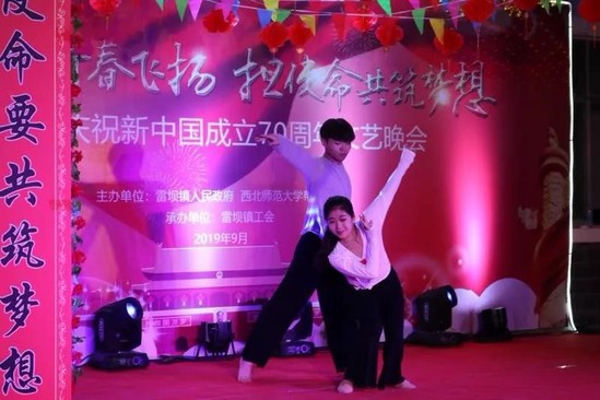9月26日,西北师大在礼县雷坝镇举办“践初心让青春飞扬,担使命共筑梦想”助力精准脱贫攻坚暨庆祝中华人民共和国成立70周年文艺汇演。学校艺术教育中心师生、学校驻村帮扶工作队和雷坝镇全体干部、部分群众观看演出。