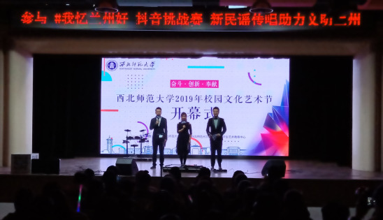 10月23日,西北师大2019年校园文化艺术节开幕式暨“我忆兰州好”城市民谣唱演会在学生发展中心上演。兰州市广播电视台主持人杨安、谢瓅、王倩携本土知名歌手和我校青年学生带来的《我忆兰州好》《最炫牛肉面》《你好兰州》《魅力兰州》等兰州市文明城市创建活动新民谣,共同拉开了我校2019年校园文化艺术节的大幕。