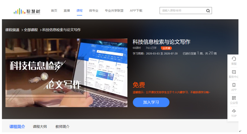 目前,《科技信息检索与论文写作》课程不但可以通过“共享课”形式进行混合式教学与在线学习,而且提供“公开课”的方式供公众学习。