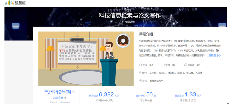 由西北师大化学化工学院王荣民教授课程团队建设完成的《科技信息检索与论文写作》在线课程于2019年9月在智慧树平台上线运行。