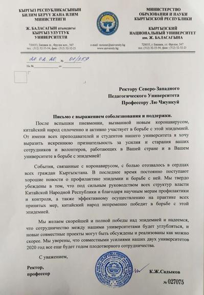 吉尔吉斯斯坦国立民族大学卡·冉·萨德阔校长在慰问信中说:在中华人民共和国遭受新型冠状病毒侵袭之后,吉尔吉斯斯坦人民与中国人民心心相惜、患难与共。衷心祝愿中国能早日取得抗击疫情的全面胜利。同时,希望能深化与贵校的合作,尽快讨论、实现两所高校之间的合作项目。
