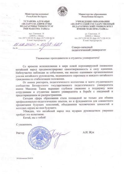 白俄罗斯国立师范大学校长亚历山大·茹科教授在来信中高度赞赏中国政府和每位中国公民为遏制疫情所做的努力,并对我校师生表示深切的尊重和支持,相信在中国政府的英明领导下,中国人民一定能够很快战胜疫情。