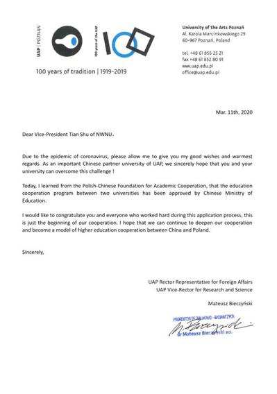 波兰波兹南艺术大学国际事务副校长马修斯博士代表该校向我校表示诚挚慰问,同时也对今年两校申请举办中外合作办学项目顺利获中国教育部批准表示祝贺,希望两校继续深化合作,共同打造中波高等教育领域合作的典范。