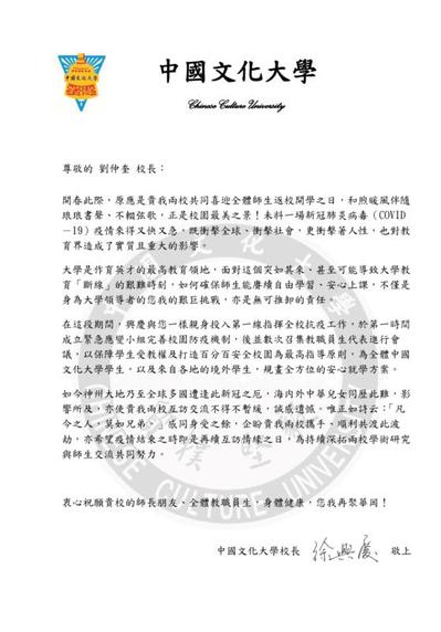 台湾中国文化大学徐兴庆校长在来信中表示,大陆疫情牵动全球中华儿女之心,“凡今之人,莫如兄弟”,期盼两校携手共渡难关,疫情结束后继续开展校际合作项目,深化两校合作伙伴关系。