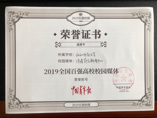 据悉,寻找“全国百强校媒”活动由《中国青年报》、中青校媒主办,《中国青年报》校媒秘书处终审,经过校园影响力、品牌活动、优质内容等指标综合评比,最终,西北师大传媒学院新闻中心脱颖而出,成为2019年“高校组百强校园媒体”,传媒学院党委副书记、副院长甘雯获“优秀指导教师”荣誉称号。