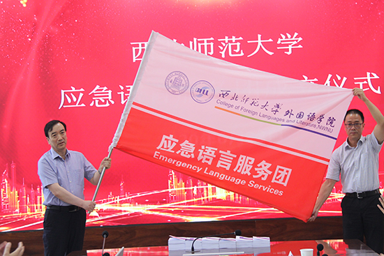 外国语学院院长曹进带领应急语言服务团师生代表宣誓,特邀“线上”代表王立非,应急语言服务团教师代表宁振业、学生代表王世莹先后发言;田澍向应急语言服务团代表授志愿服务旗帜,与会嘉宾向服务团师生代表佩戴志愿服务徽章;曹进作了主题为“生命、善良、道义与责任”的第一期专题培训。