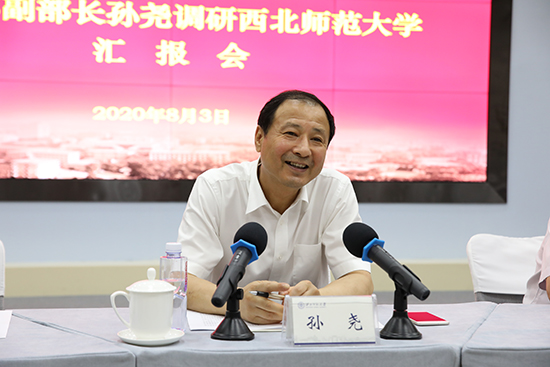 孙尧在听取了学校工作汇报后指出,西北师大在长期办学历程中,特别是在兰州办学以来,扎根西北、不忘初心,形成了光荣的历史传统和办学精神,为服务国家教育事业和地方经济社会发展做出了重要贡献。在打好打赢脱贫攻坚战的关键时刻,西北师大要发挥优势,积极配合协助天津大学和中央财经大学做好在宕昌县的教育扶贫工作;要聚焦教师教育办学特色,在质量建设和内涵建设上下足功夫,积极做好双一流大学建设的西部文章;要围绕立德树人根本任务,坚持以德为先、育人为本,进一步加强师生思想政治教育和师德师风建设工作,树立和弘扬优良的校风、教风和学风;要抓住信息技术变革的机遇,深入研究以5G为代表的新技术、新方法、新手段对教育领域带来的深刻变化和影响,主动搭上信息技术的快车,在教育信息化方面实现新的发展跨越。