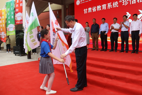 省委常委、省委宣传部部长王嘉毅出席启动仪式并为西北师大“学生餐饮文明监督岗”“文明用餐志愿服务队”“光盘行动新媒体宣传队”授旗。