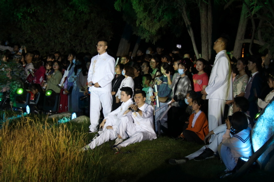 本次音乐诗会在舞蹈《花好月圆人如意》中拉开帷幕,营造出喜庆团圆的氛围。朗朗月光中,文学院“子衿”诗社的同学们精彩演绎了《无衣》《采薇》;传媒学院的诗朗诵《月光还是少年的月光》不断唤起人们的淡淡乡愁、家国情怀;音乐学院师生表演的《春江花月夜》《但愿人长久》《缘分一道桥》《望月》《茉莉花》《花好月圆》表现了初秋夜如意湖边的皓月美景,将观众的思绪带向诗意远方;外国语学院《我爱你中国》以中英文双语诵读的方式讴歌新时代,祝愿祖国繁荣富强;甘肃省著名朗诵家临溪、海玲、张宁、彭嘉四位老师朗诵了《秋天里的中国》,歌颂祖国71年来取得的巨大成就,将整场活动推向高潮;传媒学院李丽、国际文化交流学院郑绍婷、外语学院郭亚文、音乐学院杨鹏宏四位老师的散文诗朗诵《大学与大树》展现了百年学府的历史传承与文化积淀;《一封家书》则遥寄思念、传递温暖,深深打动了在场观众;大学生艺术团的诗词快闪《青春有诗意》更以新颖独特的演绎方式,吟赏明月、歌颂诗意青春。音乐诗会在歌伴舞《节日欢歌》中拉下帷幕。