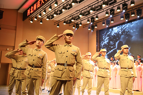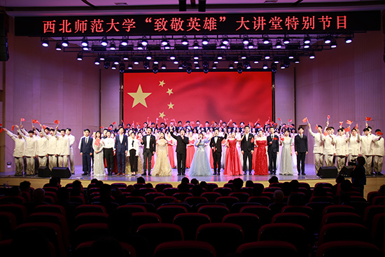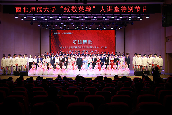 仪式上,与会领导、嘉宾共同观看精彩演出。演出在情景合唱《中国人民志愿军战歌》中拉开帷幕;歌舞《祖国不会忘记》深情怀念血染沙场的英雄儿女们;舞蹈《红流》演绎了西北师大一脉相承的教育初心;诗朗诵《谁是最可爱的人》再现了志愿军战士大无畏革命英雄气概;合唱《英雄赞歌》深情讴歌志愿军战士的革命精神;在歌曲《我的祖国》优美旋律中,仪式落下帷幕。