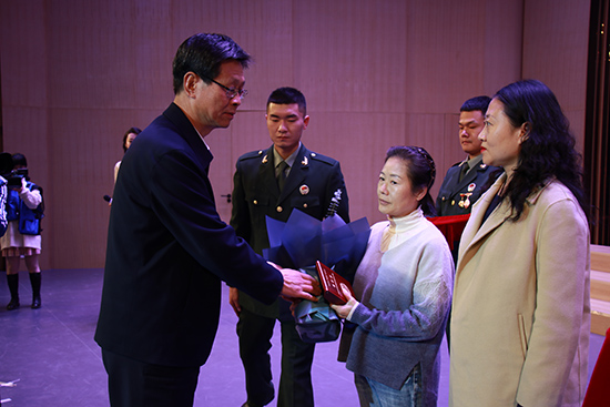 仪式上,张俊宗为蹇长春佩戴纪念章;刘仲奎为杨杰、万嵩亲属代表颁发纪念章;刘玉泉为李广岑佩戴纪念章;西北师大退伍大学生代表向抗美援朝老兵敬礼致敬。