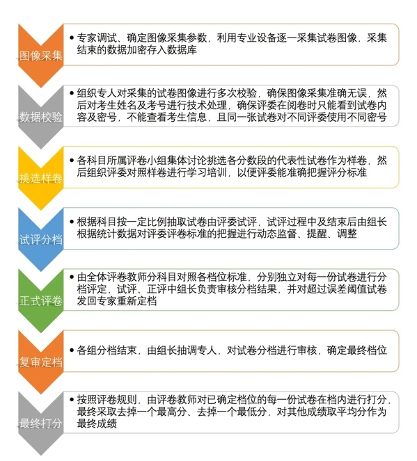 评卷分美术、书法、唐卡三个专业进行。整个评卷流程分七步:第一步,试卷图像采集。由专家调试、确定图像采集参数,利用专业设备逐一采集试卷图像,采集结束的数据加密存入数据库。第二步,数据校验。组织专人对采集的试卷图像进行多次校验,确保图像采集准确无误,然后对考生姓名及考号进行技术处理,确保评委在评卷时只能看到试卷内容及密号,不能查看考生信息,且同一张试卷对不同评委使用不同密号。第三步挑选样卷。各科目所属评卷小组集体讨论挑选各分数段的代表性试卷作为样卷,然后组织评委对照样卷进行学习培训,以便评委能准确把握评分标准。第四步,试评分档。根据科目按一定比例抽取试卷由评委试评,试评过程中及结束后由组长根据统计数据对评委评卷标准的把握进行动态监督、提醒、调整。第五步,正式评卷。由全体评卷教师分科目对照各档位标准,独立对每一份试卷进行分档评定。试评、正评中组长负责审核分档结果,并对超过误差阈值试卷发回专家重新定档。第六步,复审定档。各组分档结束,由组长抽调专人,对试卷分档进行审核,确定最终档位。第七步,最终打分。按照评卷规则,由评卷教师对已确定档位的每一份试卷在档内进行打分。最终采取去掉一个最高分、去掉一个最低分,对其他成绩取平均分作为最终成绩。
