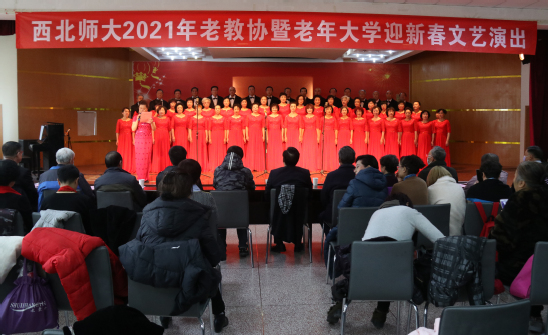 12月29日下午,西北师大2021年老教育工作者协会暨老年大学迎新春文艺演出在离退休职工活动中心开幕,西北师大副校长田澍教授、老年大学学员及200余名离退休教职工观看演出。