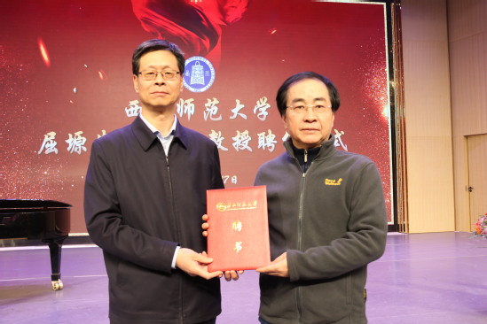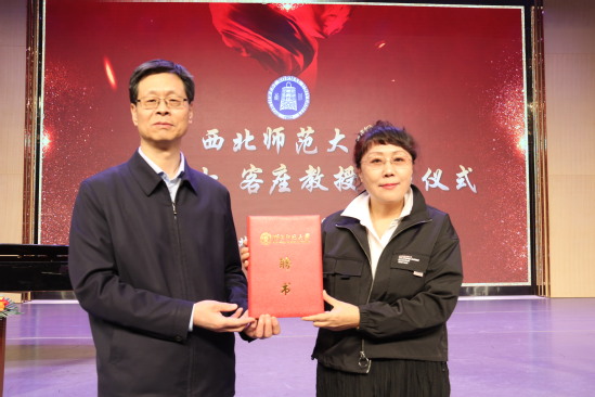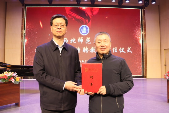 3月17日下午,西北师大张千一、屈塬、王威教授聘任仪式在音乐厅举行。校长刘仲奎为三位教授颁发了客座教授聘书,学校相关部门负责人和音乐学院师生参加聘任仪式。仪式由副校长邓小娟主持。