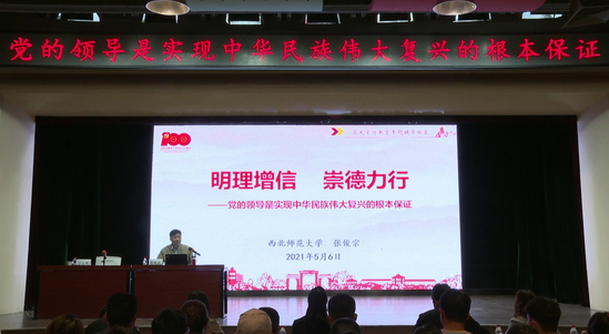 56日下午,西北师大举行党史学习教育思政理论报告会,党委书记、学校党史学习教育领导小组组长张俊宗出席并为师生党员代表作题为《明理增信 崇德力行——党的领导是实现中华民族伟大复兴的根本保证》专题辅导报告。副校长邓小娟主持报告会,党委学生工作部、团委相关负责人及全体辅导员、学生党员代表参加报告会。
