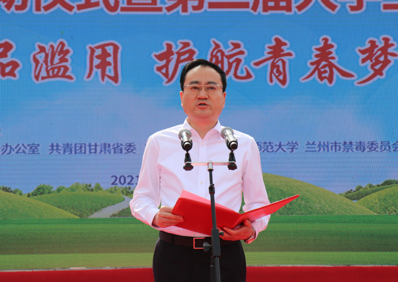 68日上午,“防范毒品滥用·护航青春梦想”为主题的“甘肃省全民禁毒宣传月启动仪式暨第二届大学生禁毒知识答题活动”在西北师大举行。甘肃省副省长、省公安厅党委书记、厅长余建出席仪式并讲话。