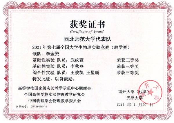 近日,由高等学校国家级实验教学示范中心联席会、全国高等学校实验物理教学研究会、中国物理学会物理教学委员会主办的“第七届全国大学生物理实验竞赛(教学赛)”举行。西北师大物理与电子工程学院本科生武纹萱、李秋燕、王俊凯和王星鹏代表西北师大在南开大学赛区参加基础实验A、基础实验B和综合实验A组竞赛。最终,西北师大获得3项全国三等奖的优异成绩。