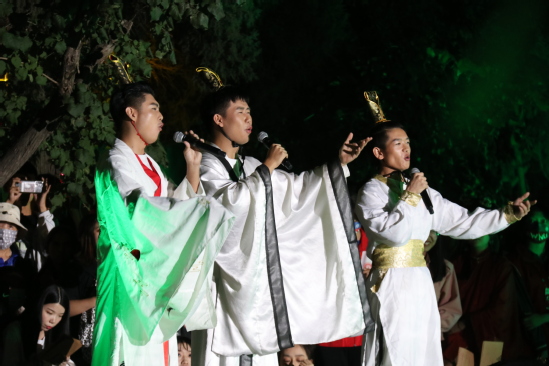 月到中秋,诗诉衷情,本届音乐诗会采用沉浸式演出的方式,带领师生歌颂盛世华章,领略传统文化韵味。音乐诗会在融合表演《月下相会》中拉开序幕;《月下抒怀》《静夜思》《秋思怀远》《亭亭山上松》《大鱼》等节目通过吟诵、舞蹈、演唱、情景表演等多种形式展现古典诗词之美,让现场师生在诗情画意中游园赏月、共度佳节;现代诗词诵读《感恩》、歌曲《一荤一素》遥寄留校师生思乡念家之情,为远方亲人送上真挚的问候;情景讲述《红色家书》《我的好兄弟陈红军》、歌舞《万疆》、朗诵《百年征程颂》讴歌百年来中国共产党为人民谋幸福、为民族谋复兴、为世界谋大同的丰功伟绩,展现了流淌在师大人血脉里的爱国情、报国志,激励全体西北师大人继往开来、砥砺前行;节目在《灯火里的中国》的美妙歌声中画上圆满句号。
