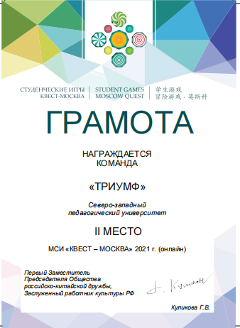 近日,由中俄友好协会、中华人民共和国驻俄大使馆和俄罗斯国立社会大学联合举办的“2021莫斯科探险”俄罗斯知识国际大赛举办。西北师大外国语学院学生孙天一、马小静、焦海艳、李瑶四人组成的参赛团队荣获二等奖。