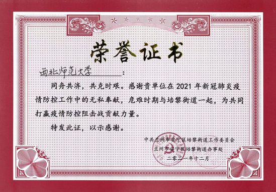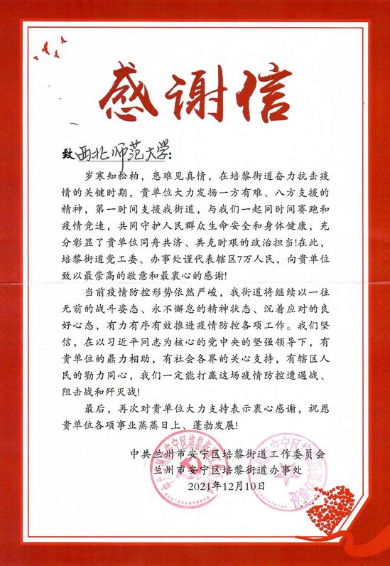 校地同心战疫情——培黎街道为西北师大赠送锦旗