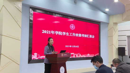 邓小娟对各学院学生工作汇报进行了点评。她指出,通过全校学生系统的共同努力和辛勤付出,2021年学校学生工作取得了满意的成绩。尤其在疫情防控期间,学生工作队伍奋战在一线,完成了五轮长达一个多月值班值守工作,确保学校疫情防控工作平稳有序。在本次学生工作效能考核汇报中,各学院汇报人形象气质好、时间把控准、语言表达流利;工作总结凝练好,整场汇报有特色、有亮点、有办法、有思考、有模式,充分表现出各学院学生工作者都在用心、用情、用力、用功做好学生教育管理服务工作。邓小娟指出,今后学校学生工作要紧紧围绕立德树人根本任务,深入贯彻落实学校第八次党代会精神,把思想政治工作贯穿于教育教学和社会实践全过程,不断推动学校学生工作迈上新台阶、取得新发展。