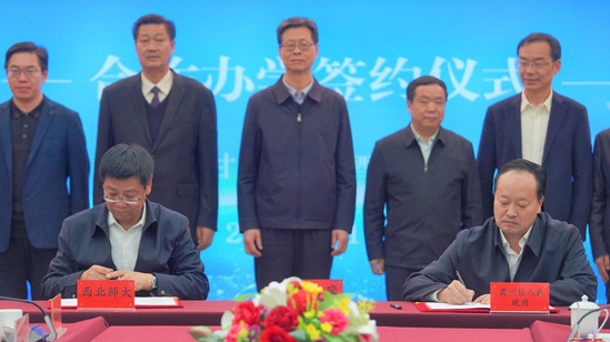 1月5日下午,西北师大与酒泉市肃州区举行合作办学签约仪式。西北师大校长刘仲奎、西北师大党委常委、副校长李朝东和学校相关部门、学院及附属中学负责人参加会议。酒泉市委常委、肃州区委书记何正军,区长王永宏,区人大常委会主任张生铭,区委宣传部部长马慧君,区人大常委会副主任王设仁,区政府副区长郭秀荣及市区相关部门和学校负责人参加合作办学签约仪式。