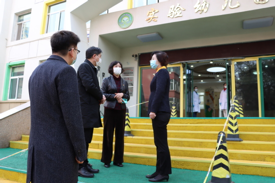 王海燕一行先后前往实验幼儿园、第二附属中学、附属小学、学生餐饮文化中心、校本部西门、兰天学生公寓等重点区域,实地查看了解学生入园接送、入校离校、校园管理、食品卫生、防疫物资储备、学生就餐、封闭管理区防疫措施落实情况,并听取相关工作汇报