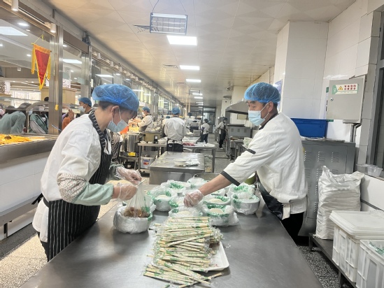 每一个清晨,当我们还蜷在被窝时,餐厅后厨师傅们已经早早准备好了色香俱全的早餐。疫情期间,餐厅严把安全“关口”,新鲜食材在采购系统下单后,经24小时核酸检测阴性人员专人专车运送到校门口,严格消毒后转运到后厨再清洗、粗加工、烹制,每日三餐在留样柜至少保存48小时,确保食材安全可溯源。