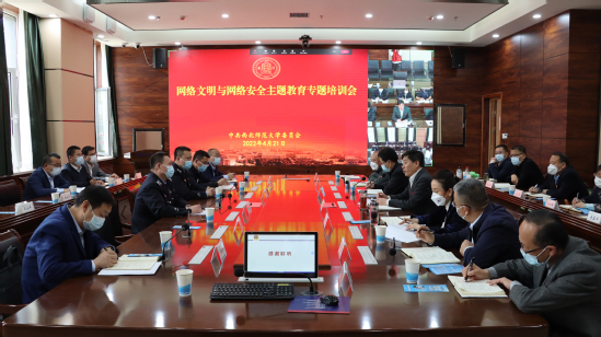 4月21日下午,西北师大召开网络文明与网络安全主题教育专题培训会。党委书记张俊宗出席会议并讲话,党委常委、党委宣传部部长、副校长邓小娟主持会议;党委常委、党委组织部部长吕文英及学校相关职能部门负责人在主会场参加会议,学校相关部门负责人、团学组织干部、班主任和研究生导师通过视频方式在线上参加培训。