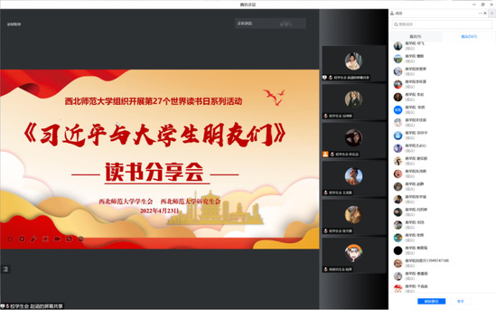 师大附中、文学院、哲学学院、社会发展与公共管理学院、数学与统计学院、化学化工学院、旅游学院、敦煌学院等单位团学组织通过线上线下相结合的方式,开展“喜迎二十大 书香沁满园”阅读交流、“春风十里 书香阅读”读书分享、“黄河颂”主题诗歌朗诵、“让阅读成为习惯”主题团日等内容丰富、形式多样的全民阅读活动,引导青年学生在阅读中汲取文化营养,在书香中传递奋进力量。