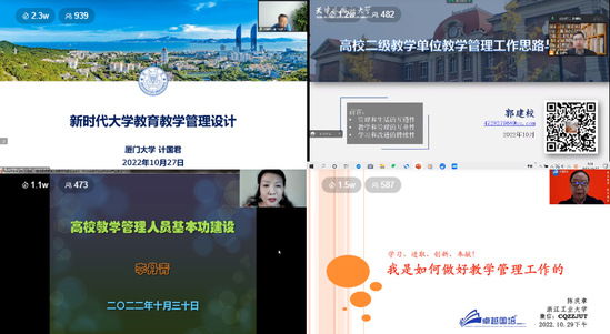 研修活动邀请来自浙江大学、厦门大学、浙江工业大学、天津外国语大学的专家学者,聚焦创新学校教学管理理念,提升教学管理服务能力主题,围绕大学教学管理与创新、教学管理人员的基本素养和能力建设、教学管理工作思路与实践等内容,通过专家在线讲解、典型案例分析、在线答疑等方式,帮助教学管理人员进一步了解大学基层教学组织的功能和构建,掌握基层教学组织的专业与课程建设、质量保障、教学运行等日常业务,探讨在“双一流”建设背景下,教学管理人员如何找准新时代教学管理人员的角色定位和工作方式,在服务教师和育人体系中扮演支撑性角色,更新服务理念,提升业务能力、执行力与工作创新力,助力教学管理工作规范运行。