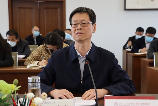 贾宁在主持会议时强调,我们要把学习贯彻全国两会精神与学习贯彻党的二十大精神结合起来,坚持以习近平新时代中国特色社会主义思想为指导,紧密结合“三抓三促”行动,引导广大师生深刻领悟“两个确立”的决定性意义,增强“四个意识”、坚定“四个自信”、做到“两个维护”;要紧扣落实立德树人根本任务,坚持“五育”并举、三全育人,努力构建更高水平人才培养体系,把学习贯彻党的二十大精神和全国两会精神转化为凝聚全体师生的信念与共识、转化为谋划学校改革发展的能力与本领、转化为推动一流大学建设的举措与成效,为全面建设社会主义现代化国家贡献教育力量;要坚持稳字当头,提高政治站位,强化政治自觉,把主动创稳工作放在心上、抓在手上、扛在肩上,确保校园安全稳定,不断增强师生的获得感、幸福感、安全感;要牢牢把握高质量发展这一主题,围绕国家加快实现高水平科技自立自强战略,持续加大人才引进力度,提高人才自主培养质量,不断开创学校各项事业高质量发展新局面。
