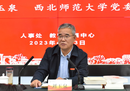 刘玉泉围绕“新时代青年教师的使命与担当”主题,从学校120多年发展历程和担负的历史使命,为新入职教师阐释了西北师大作为近代中国社会变迁的见证者、中国高等师范教育的引领者、西北师范教育的拓荒者、立德树人的光辉实践者,始终与祖国同呼吸共命运,以教育报国的实际行动展现作为、彰显担当,为甘肃乃至西北地区人才培养、科学研究、社会服务、文化传承及民族地区教育事业作出了不可替代的重要贡献。目前,在国家推进西部大开发和“一带一路”建设的新征程上,西北师大坚持立德树人根本任务,积极融入国家战略需求,建设高质量教育体系,在推进一流大学建设的道路上迈出更加坚实的步伐。