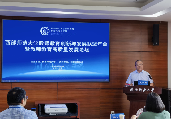 723日至25日,由田家炳基金会支持、陕西师范大学主办的西部师范大学教师教育创新与发展联盟年会暨教师教育高质量发展论坛在陕西师范大学召开。19所联盟院校代表和陕西教师教育创新与发展联盟的10所院校代表参加,西北师大副校长张明军参加会议并作交流发言。