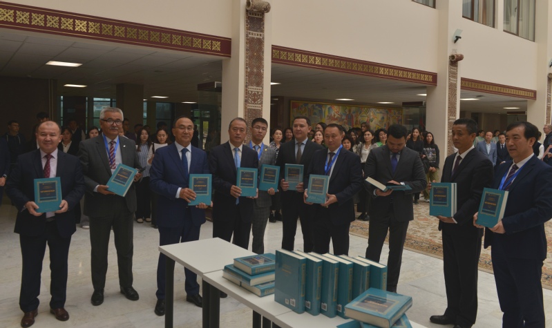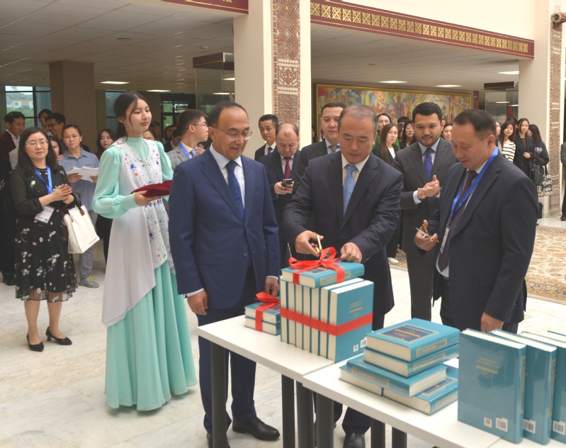 赠书仪式上,王占仁、萨德科夫·叶尔兰·巴塔舍维奇、田澍共同向哈萨克斯坦科学和高等教育部、哈萨克斯坦部分高校及在哈资机构赠送《哈萨克斯坦常用法律》。