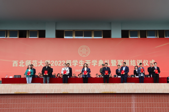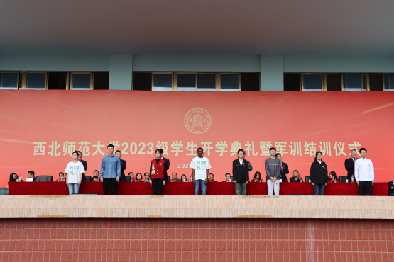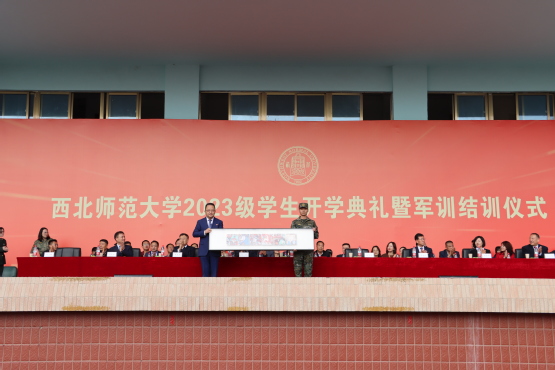 党委书记贾宁,校领导马庆、李建民、李文生,武警兰州支队中校、副参谋长张贤港同志出席仪式。党委常委、党委宣传部部长、副校长邓小娟主持仪式。武警兰州支队军训教官、各学院负责人、学校军训工作领导小组全体成员、2023级全体新同学,班主任、辅导员代表、后勤保障人员、新生家长代表等7000余人参加仪式。